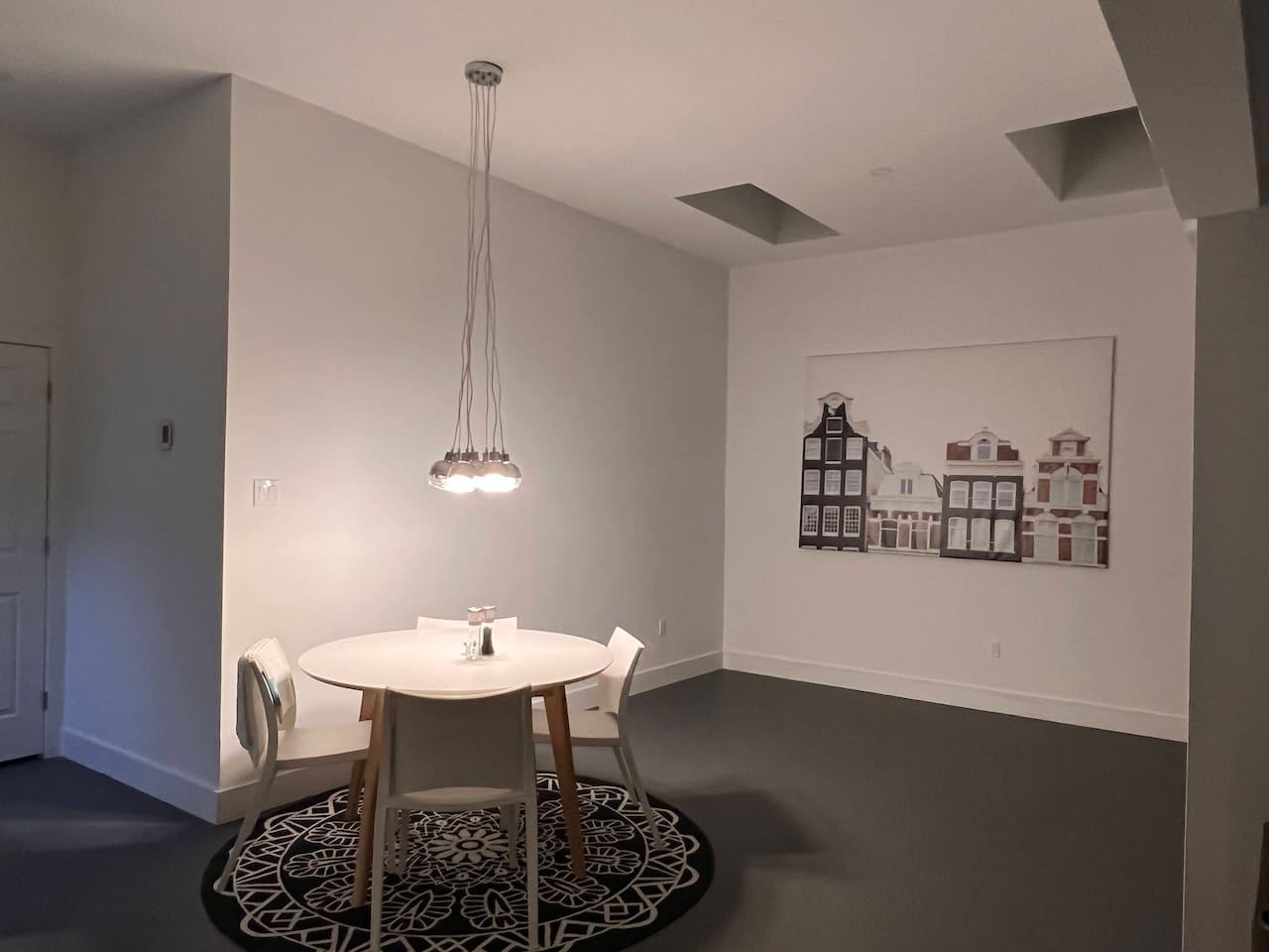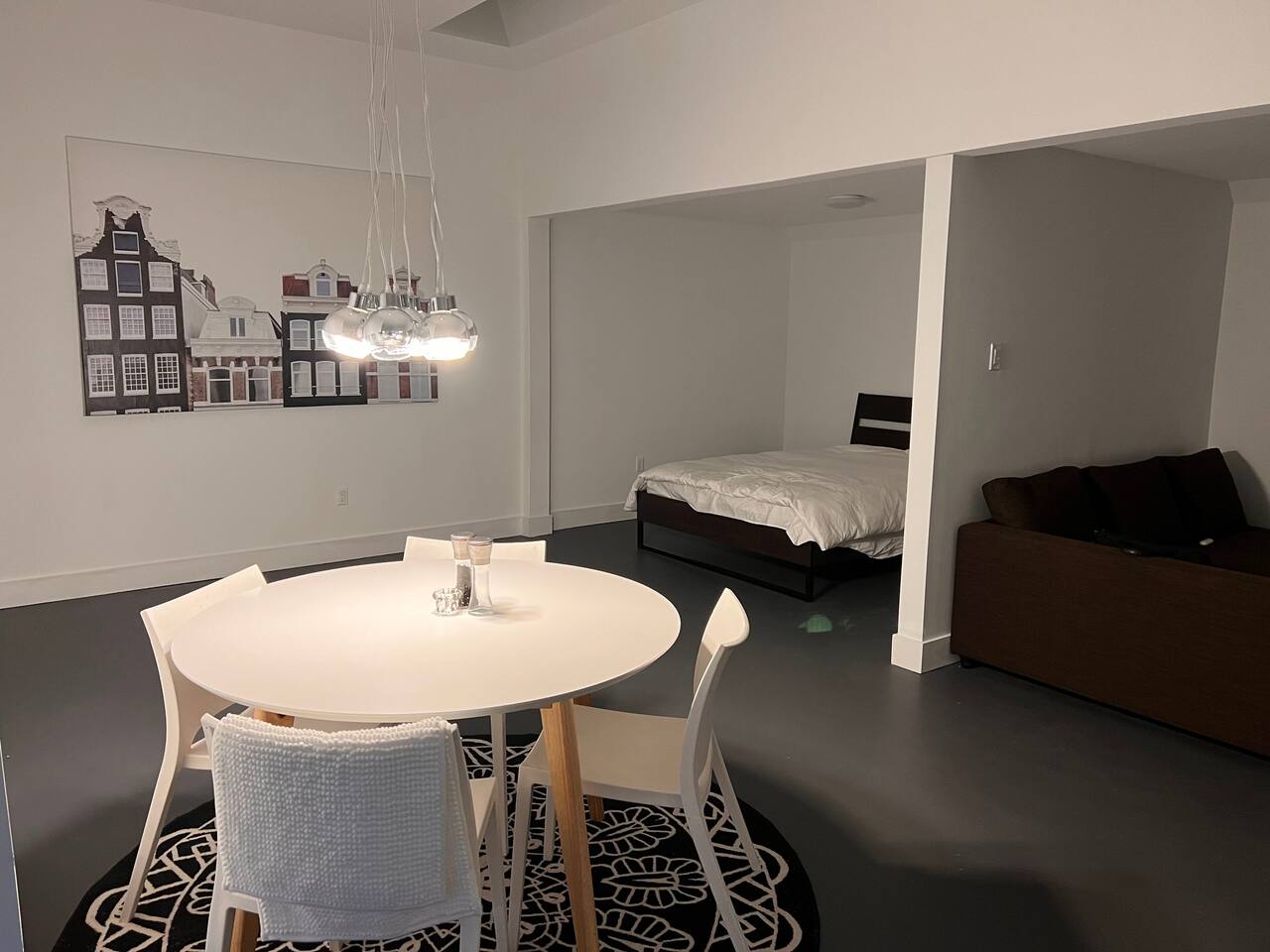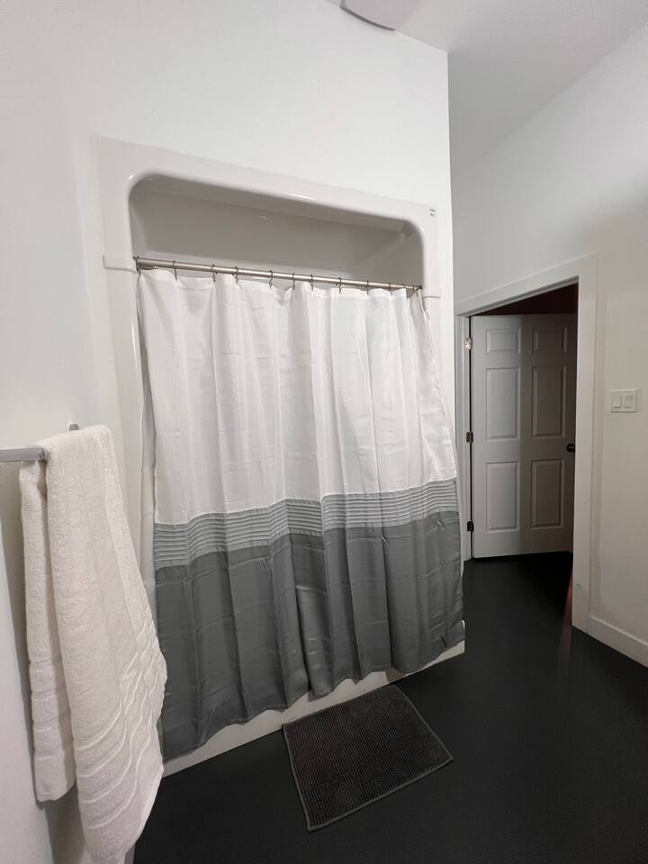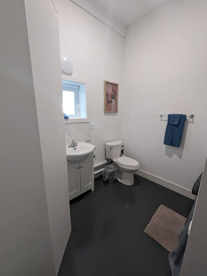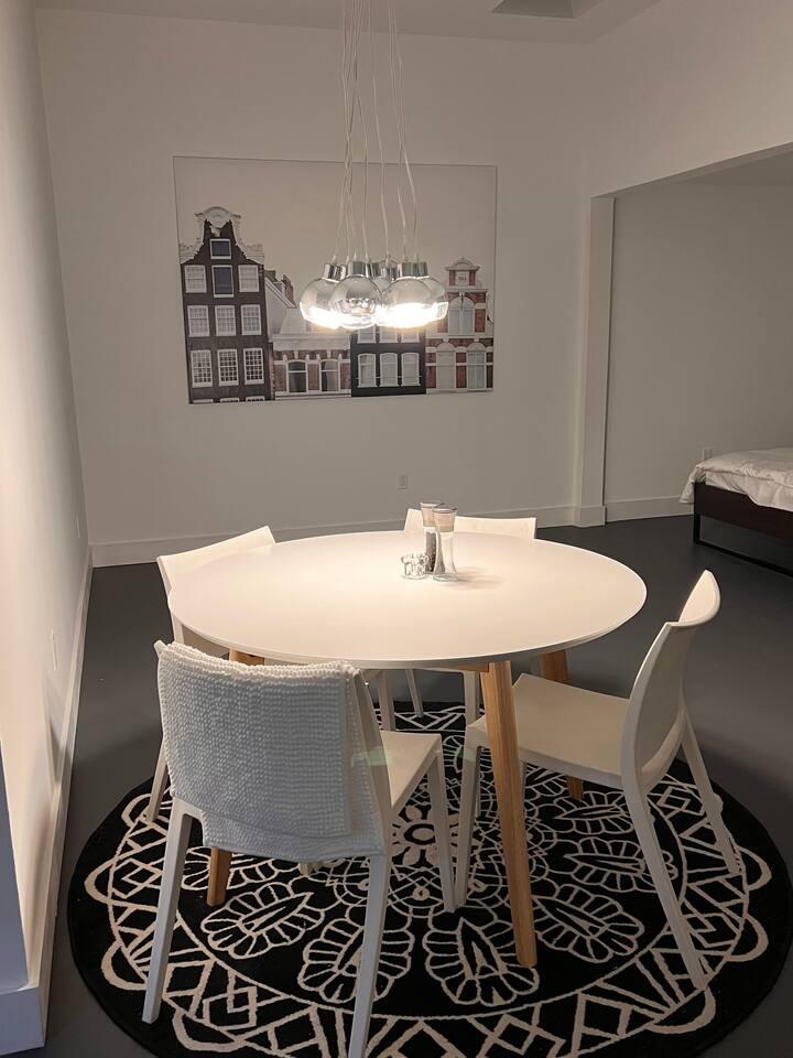 This is a beautifully renovated space in our garage that is very open, with extremely high ceilings and in-floor radiant heat.