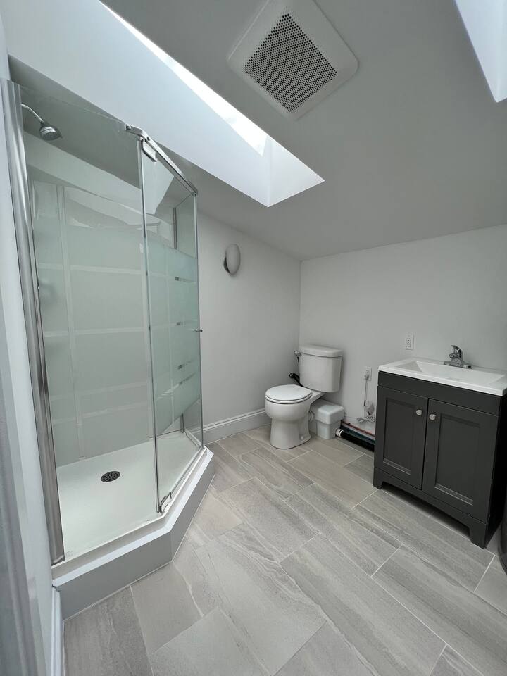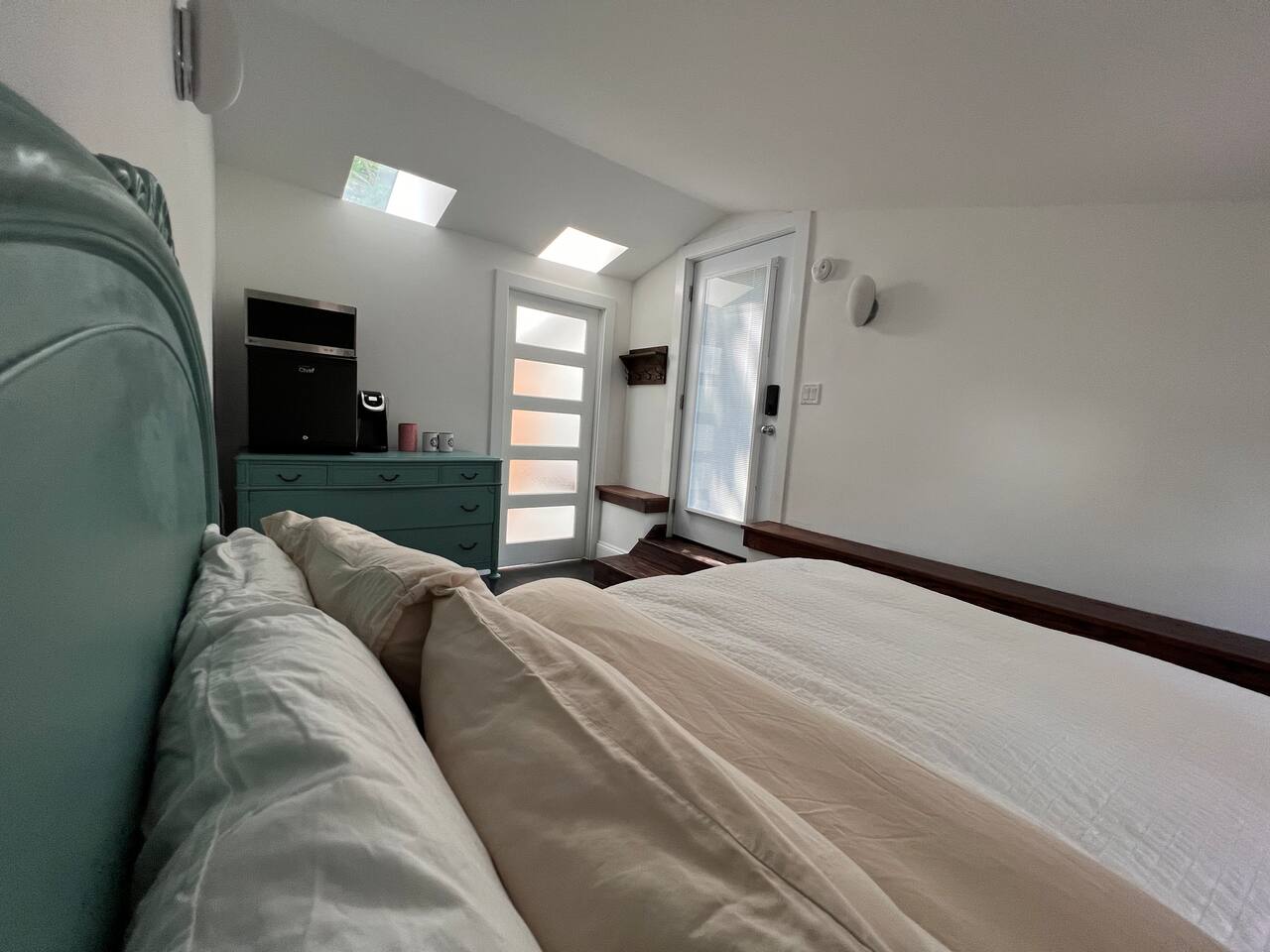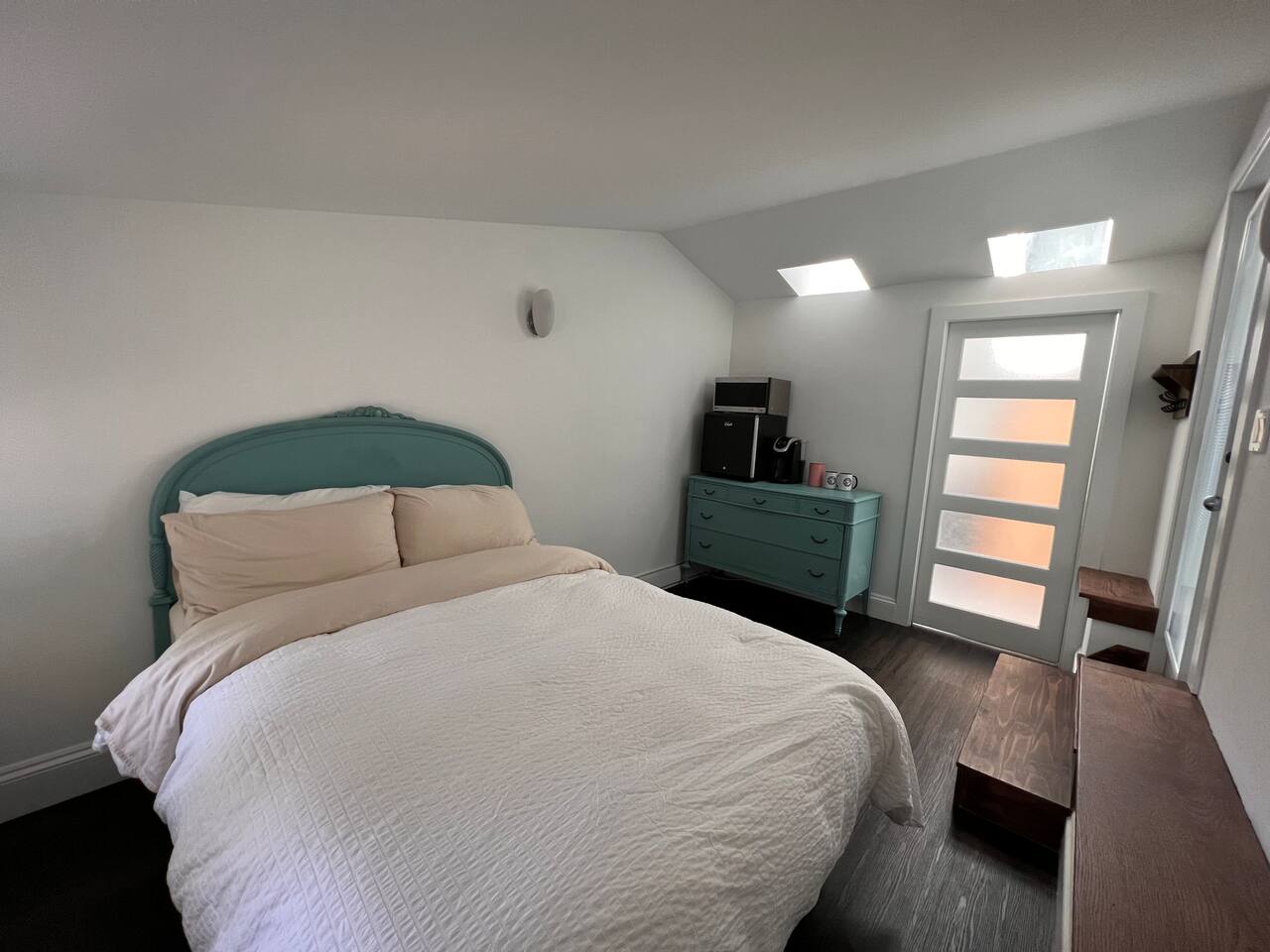 Wonderful unique space filled with lots of light . There is a double bed and is a private bathroom in the loft. Think of a hotel room located in a quiet residential home. There’s a microwave fridge and coffee maker.